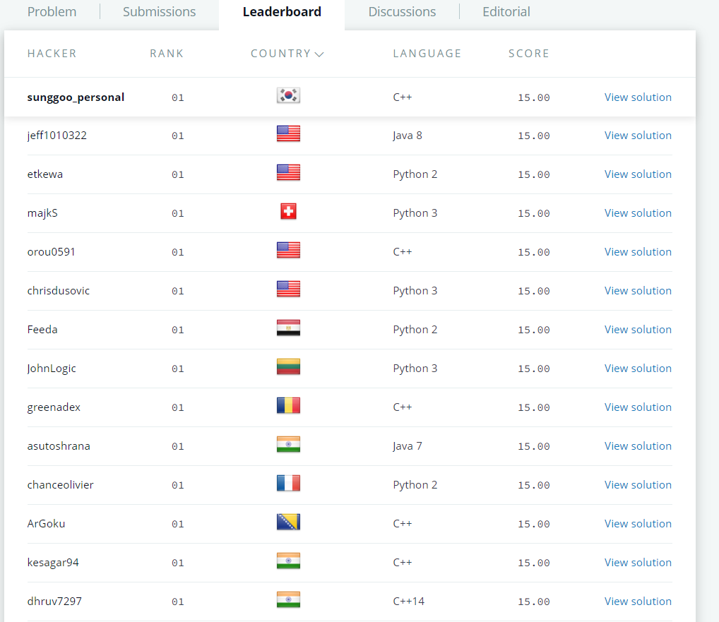 submission 을 하고나면 다음과 같이 리더보드를 확인할 수 있는데요 여기서 View Solution 버튼을 누르면 다른사람이 작성한 코드도 확인해 볼 수 있습니다.