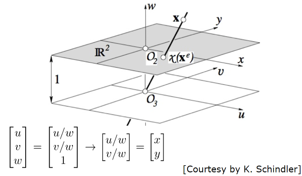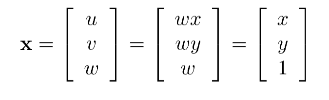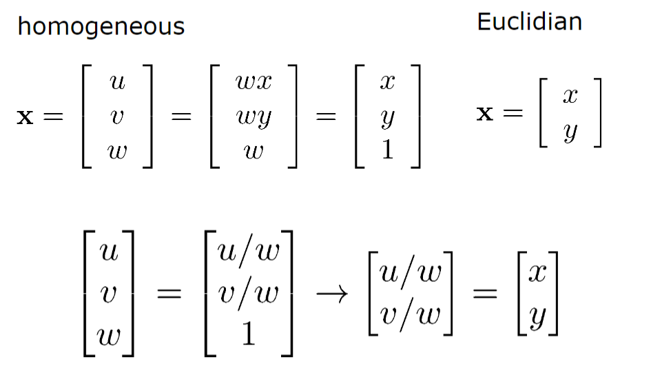 유클리디안 공간에서의 좌표 [x,y]는 회색으로 표현된 평면 $\Re^2$상의 한 점 $\chi$ 이고 Homogeneous공간에서는 선 $\mathbf{x}$상에서 scaling factor $\lambda$를 따라 움직이게 된다. 즉 Homogeneous 공간에서 선 $\mathbf{x}$에 있는 모든 점들은 Cartesian공간의 좌표 [x,y]와 완전히 동일 하다. 그러므로 Homogeneous 좌표의 세번째 성분으로 모든 성분을 나누어서 세번쩨 성분을 1로 만들면 Cartesian 공간에서의 좌표가 된다.