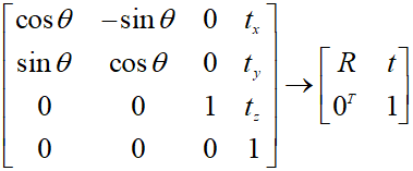 마찬가지로 이를 3차원으로 확장해서 z축에 대해 회전하는 변환은 다음과 같이 표현할 수 있다.