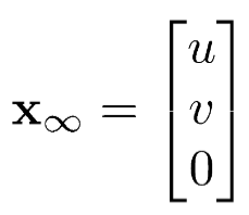 그렇다면 무한히 멀리 있지만, 2차원 이미지 상에서 한점으로 나타나는 점은 다음과 같이 표현할 수 있다. 즉 3차원 공간상에서 무한히 멀리있는 한 점이 projection ray를 따라 이미지의 한pixel로 나타난다. cartesian 좌표계에서는 이 무한한 좌표를 표현할 수 있는 마땅한 방법이 없지만, homogeneous 좌표계 에서는 유한한 값을 가지는 형태로 표현할 수 있다.