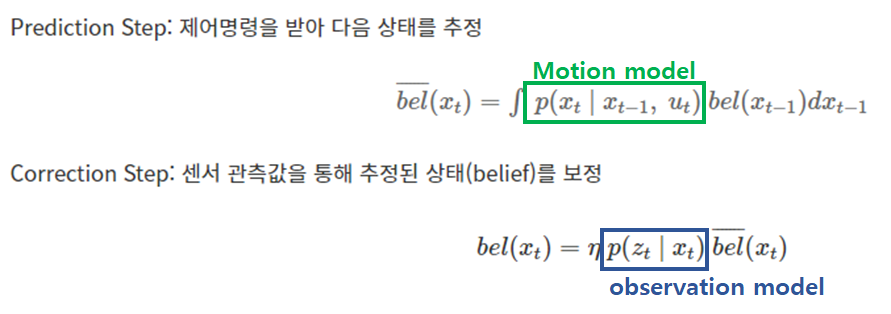 이때 prediction step에서의 $p(x_t\ |\ x_{t-1},\ u_t)$는 타임 $t-1$에서 제어명령을 받아 다음 state가 어떻게 발전하는지 보여주기 때문에 motion model이라고 부르고, correction step에서의 $\eta\ p(z_t\ |\ x_t)$는 특정한 state에서 관측값의 likelihood에 대해 알려주기 때문에 sensor model 또는 observation model 이라고 부른다.