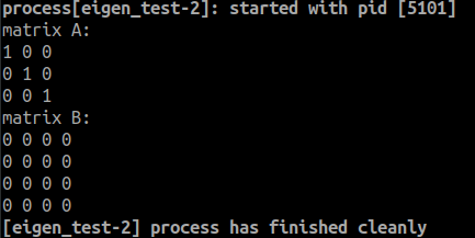 A Matrix는 Comma Initialize를 사용하였는데 이때는 'row by row' 순서로 ((0,0)->(0,1)->(0,2)->(1,0)...) 값을 초기화 한다. 이방법을 사용할 때 주의할 점은 행렬의 숫자와 동일한 모든 변수를 초기화 해줘야 한다는 것이다. 위의 예에서는 3x3행렬 이기 때문에 9개의 변수를 모두 초기화 해줘야 하며 그렇지 않을 경우 오류가 발생한다. B Matrix는 괄호연산자 (Paranthesis Operator)를 사용하여 각각의 index에 값을 초기화 해주었다. C/C++ 또는 python은 array에 square bracket [ ]을 사용하는 것에 반해 Eigen에서는 괄호 ( )를 사용한다는것에 유의 해야 한다. 테스트 결과는 다음과 같다.